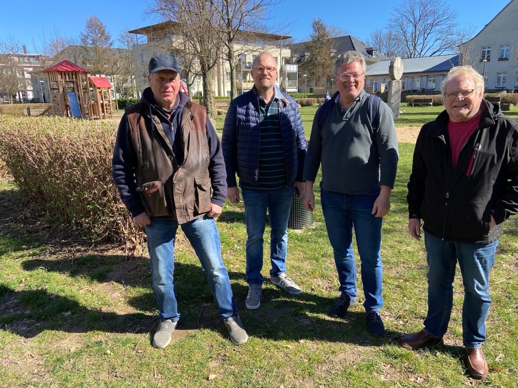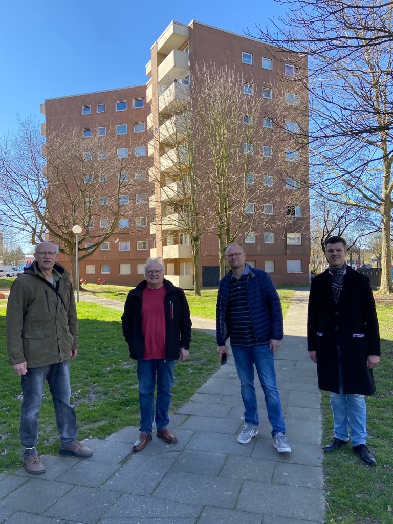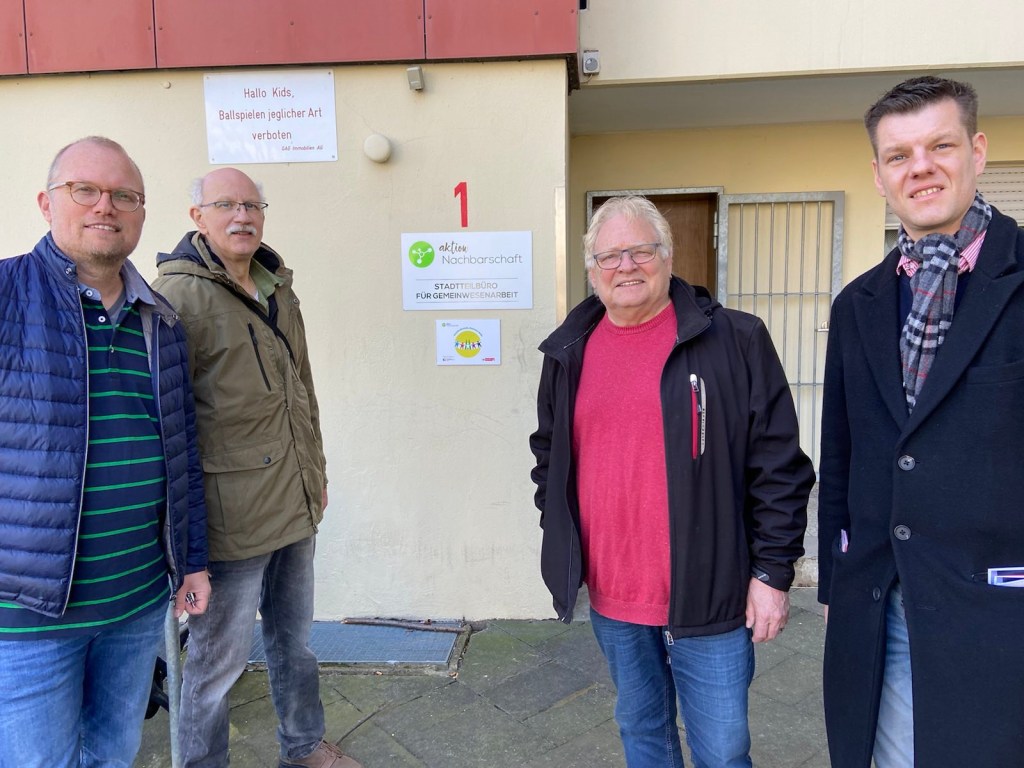 Der SPD-Kandidat für die Landtagswahl, Jochen Ott (2. v.r.), mit Mitgliedern des Ortsvereins bei den Wohnhäusern am Ossendorfer Weg. Jochen Ott informierte sich dort auch über die Arbeit des Vereins „Aktion Nachbarschaft“.