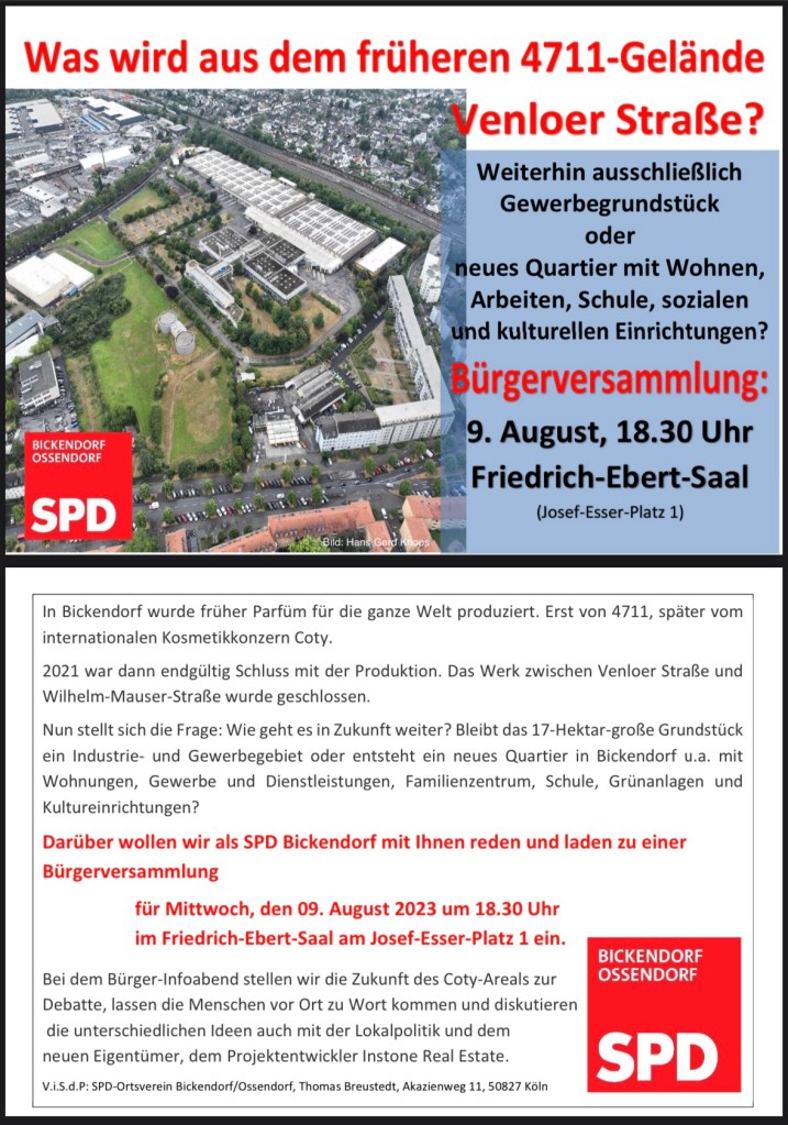 Allgemein Was wird aus dem ehemaligen 4711-Gelände? Einladung zur Bürgerversammlung Verfasst von spdossendorf/bickendorf am 20. Juli 2023 Teilen mit: Klicke, um auf X zu teilen (Wird in neuem Fenster geöffnet) X Klick, um auf Facebook zu teilen (Wird in neuem Fenster geöffnet) Facebook Gefällt mir Wird geladen …