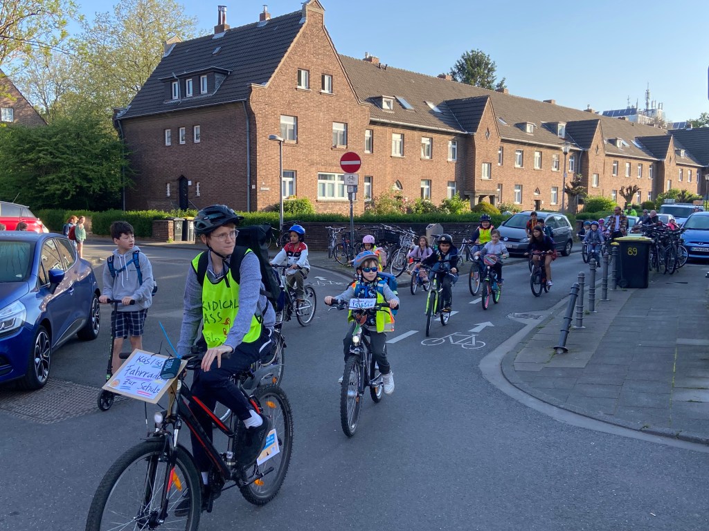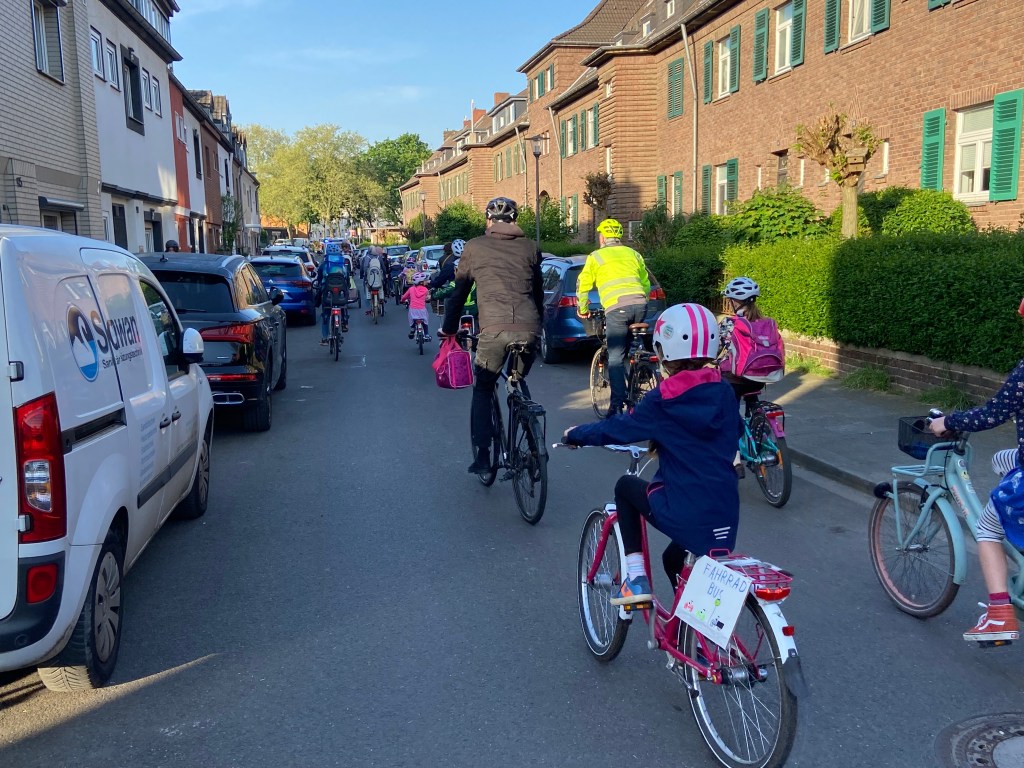 Eltern, Kinder und Lehrer*innen bilden mit ihren Rädern einen „Fahrradbus“, um auf die Schulwegsicherheit im Bereich Erlenweg aufmerksam zu machen. Viele Bickendorfer*innen und auch Ossendorfer*innen kennen die teilweise katastrophale Verkehrssituation auf dem Erlenweg, auf dem Weg zur Venloer Straße. Dies trifft insbesondere die Zeit des Schulbeginns und zum Schulende.