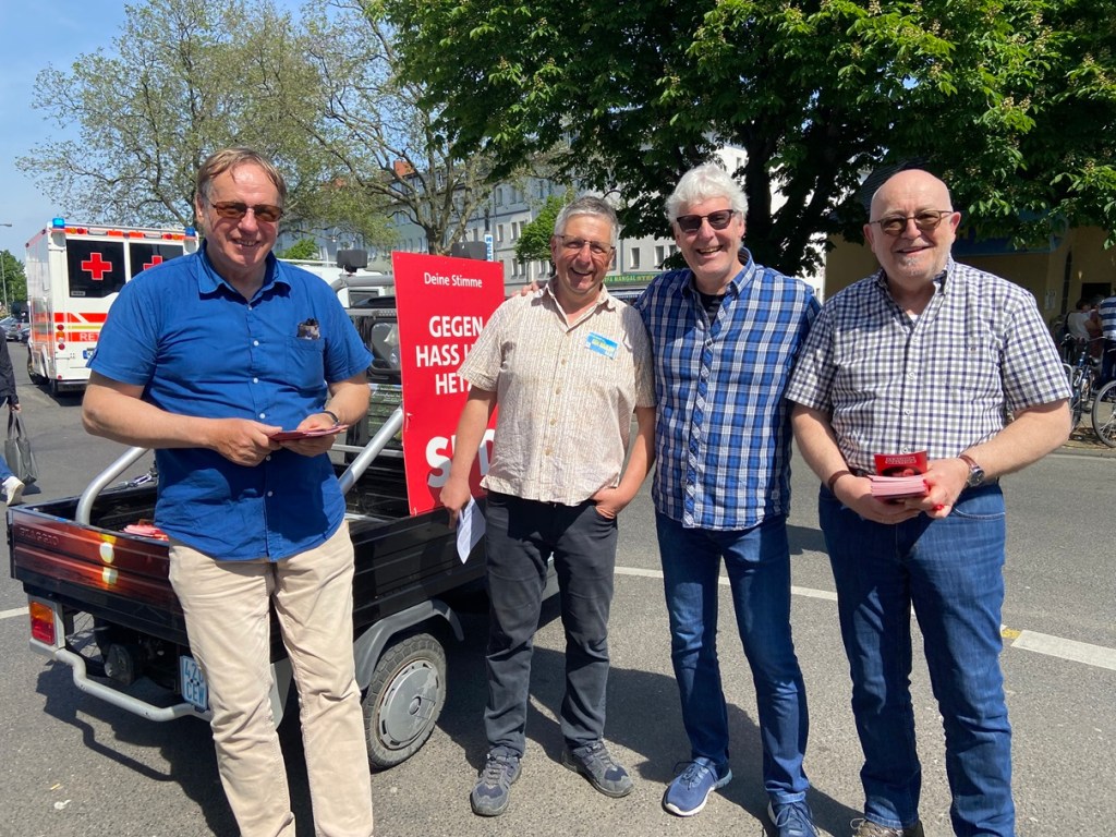 Mit einer Piaggio Ape des stellvertretenden Ortsvereinsvoritzenden Kalle Joest sind wir am Samstag bei strahlendem Sonnenschein in den Straßenwahlkampf auf dem Rochusplatz gestartet. Im Gespräch mit den Bürgerinnen und Bürger zeigt sich, dass wir noch viel Überzeugungsarbeit leisten müssen, die Menschen für die Europawahl zu gewinnen.