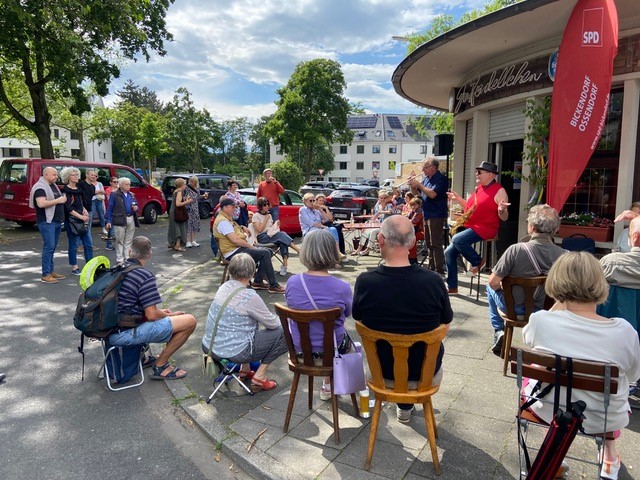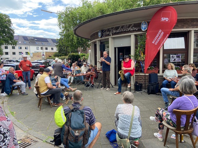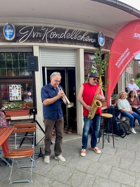 „Danke für die gute Idee, die Konzerte zu retten“, freute sich eine Besucherin des Jazz-Konzerts vor dem Rondellchen. Denn mit Hilfe der SPD Bickendorf-Ossendorf gibt es in diesem Sommer eine Fortsetzung der Jazz-Konzerte von Bernd Delbrügge (Saxophon) und Ebasa Pallada (Trompete). Das erste von vier Konzerten spielten die beiden Musiker vor dem Rondellchen in Bickendorf und rund 70 Freundinnen und Freunde des Jazz lauschten begeistert. Und sie ließen sich die gute Stimmung auch nicht durch einen kurzen, aber heftigen Regenschauer trüben. Kurzerhand wurde in der Kneipe weitergespielt.