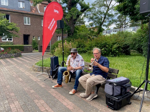 Nach dem erfolgreichen Auftakt vor dem Rondellchen spielten die beiden Jazz-Musiker Bernd Delbrügge (Tenor Saxophon) und Sebastian „Ebasa“ Pallada (Trompete) ihren beliebten Sommer-Jazz auf dem Josef-Esser-Platz – mit Unterstützung der SPD Bickendorf-Ossendorf.