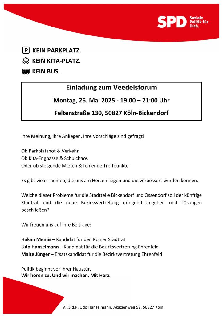 am kommenden Montag, den 26. Mai 2025, findet unser Veedelsforum mit Mitbürgerinnen und Mitbürgern von 19:00 bis 21:00 Uhr im Feltenheim statt.