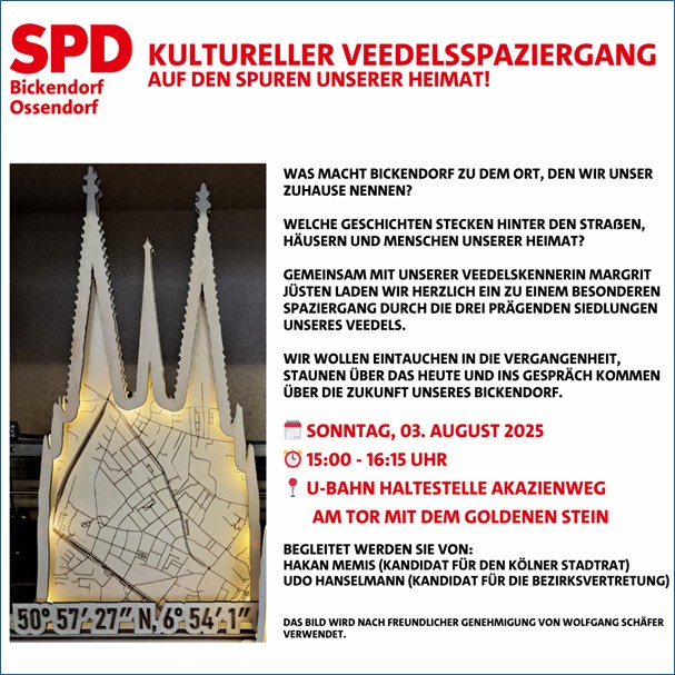 Begleitet wird der Spaziergang von unseren SPD-Kandidaten Hakan Memis (Stadtrat) und Udo Hanselmann (Bezirksvertretung Ehrenfeld), die im Anschluss gern mit Ihnen ins Gespräch kommen.