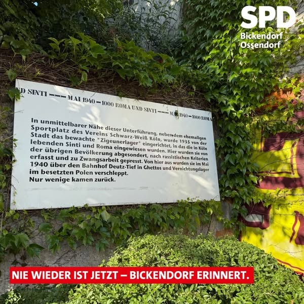 Am 16.05 haben unser 1. Stellvertretende Bezirksbürgermeister Udo Hanselmann, unser Kandidat für den Kölner Stadtrat Hakan Memis sowie weitere Genossinnen und Genossen unseres Ortsvereins an der Gedenkveranstaltung „Mai 1940 – 1000 Roma und Sinti“ in Köln-Bickendorf teilgenommen. In unmittelbarer Nähe der heutigen Unterführung, nahe dem ehemaligen Sportplatz von Schwarz-Weiß Köln, stand einst das sogenannte “Zigeunerlager”. 1935 von der Stadt Köln eingerichtet, wurden hier Sinti und Roma unter menschenunwürdigen Bedingungen interniert – abgegrenzt, erfasst, entrechtet und zur Zwangsarbeit gezwungen.